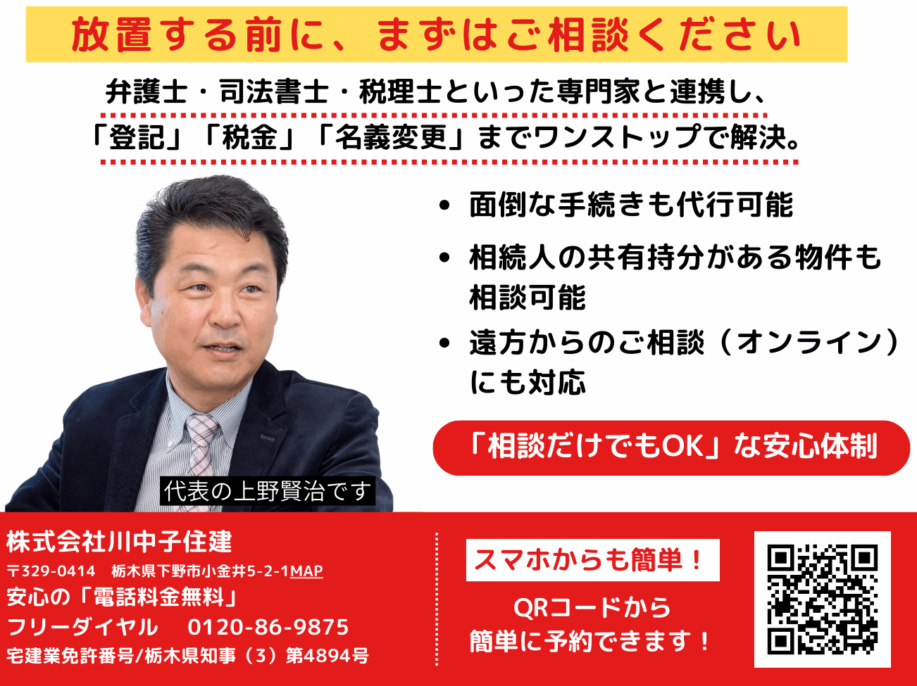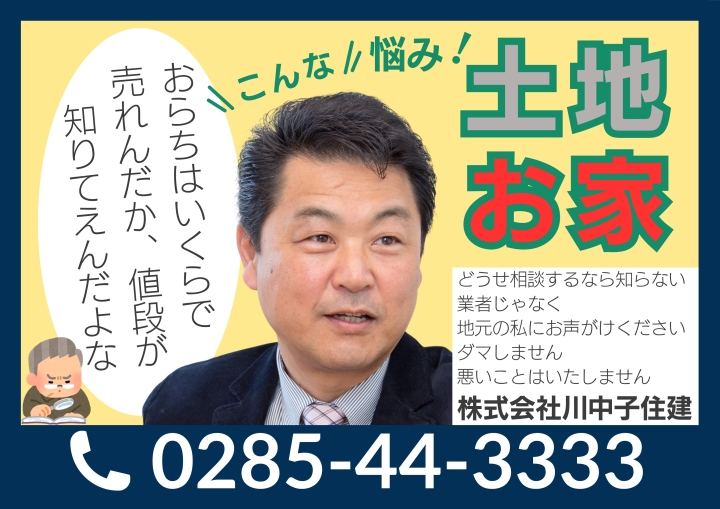 株式会社川中子住建代表取締役 上野賢治 建築業許可番号/栃木県知事許可(般-4)第18126号 二級建築士事務所登録番号/ 栃木県知事登録(B)第3711号 宅建業免許番号/栃木県知事(3)第4894号地元の川中子住建です